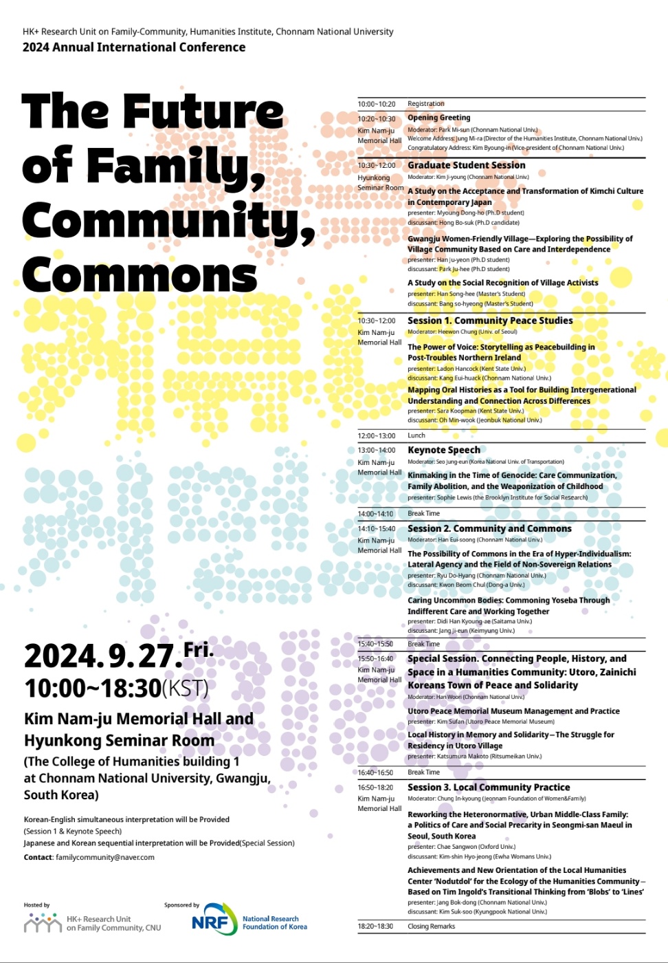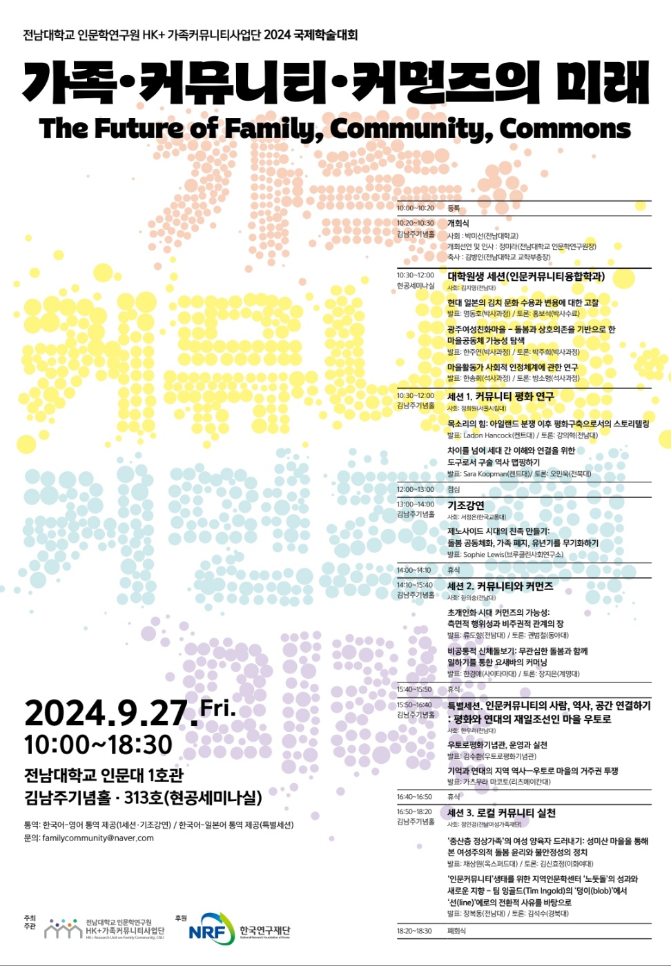 전남대학교 인문학연구원 HK+가족커뮤니티사업단은 급변하는 가족과 커뮤니티 환경을 분석하고 미래를 견인할 수 있는 실천적 가치를 발굴하기 위해 매해 국제학술대회를 개최하고 있습니다. 2020년 <신자유주의 시대의 가족과 커뮤니티>, 2021년 <가족과 커뮤니티의 관계정치학: 포용적 커뮤니티에 대한 상상, 실천 그리고 수행>, 2022년 <다성적 주체론 모색>, 2023년 <가족과 커뮤니티 내의 복수의 시간성과 복수의 공간성>에 이어 올해에는 <가족·커뮤니티·커먼즈의 미래>라는 주제로 여러분을 모시고자 합니다.