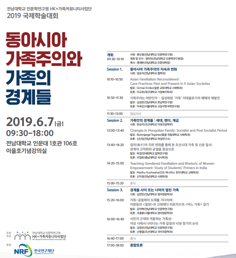 개최 개요 : 동아시아 문화권에서 가족은 개인의 삶과 행위 그리고 사회적 관계에서 큰 비중을 차지했다. 동아시아 가족주의는 흔히 개인보다 공동체를 우선하는 것으로 서양의 개인주의에 비해 평가절하 되며, 가부장적 가족체계와 위계적 인간관계를 파생한 부정적 원인으로 지목된다. 하지만 가족주의는 그 자체로 부정되어야 할 것인가? 오히려 동아시아 가족주의가 서양의 자율적 개인의 신화를 상대화할 수 있는 관계적 개인의 탄생, 나아가 이기적 나르시시즘 문화에 대항하는 공동체 가치의 회복 가능성을 담지한 것은 아닐까?