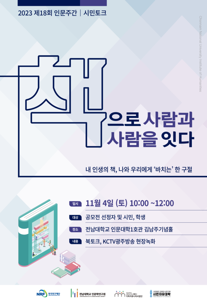 안녕하세요. 전남대학교 인문학연구원 지역인문학센터 ‘노둣돌’입니다. 2023년 제18회 인문주간을 맞아 “함께 살아가는 인문학. 함• 삶•인人”을 주제로 시민 여러분과 함께하고자 합니다. ■  인문주간 프로그램, “광주시민 ‘시’ 낭송회 - 시의 운율에 사랑을 싣다”